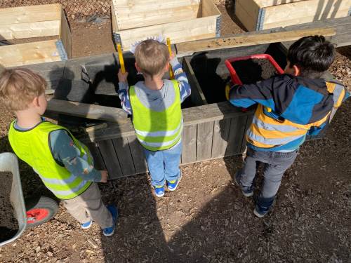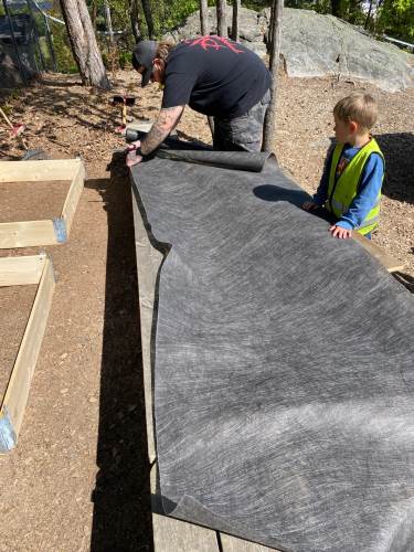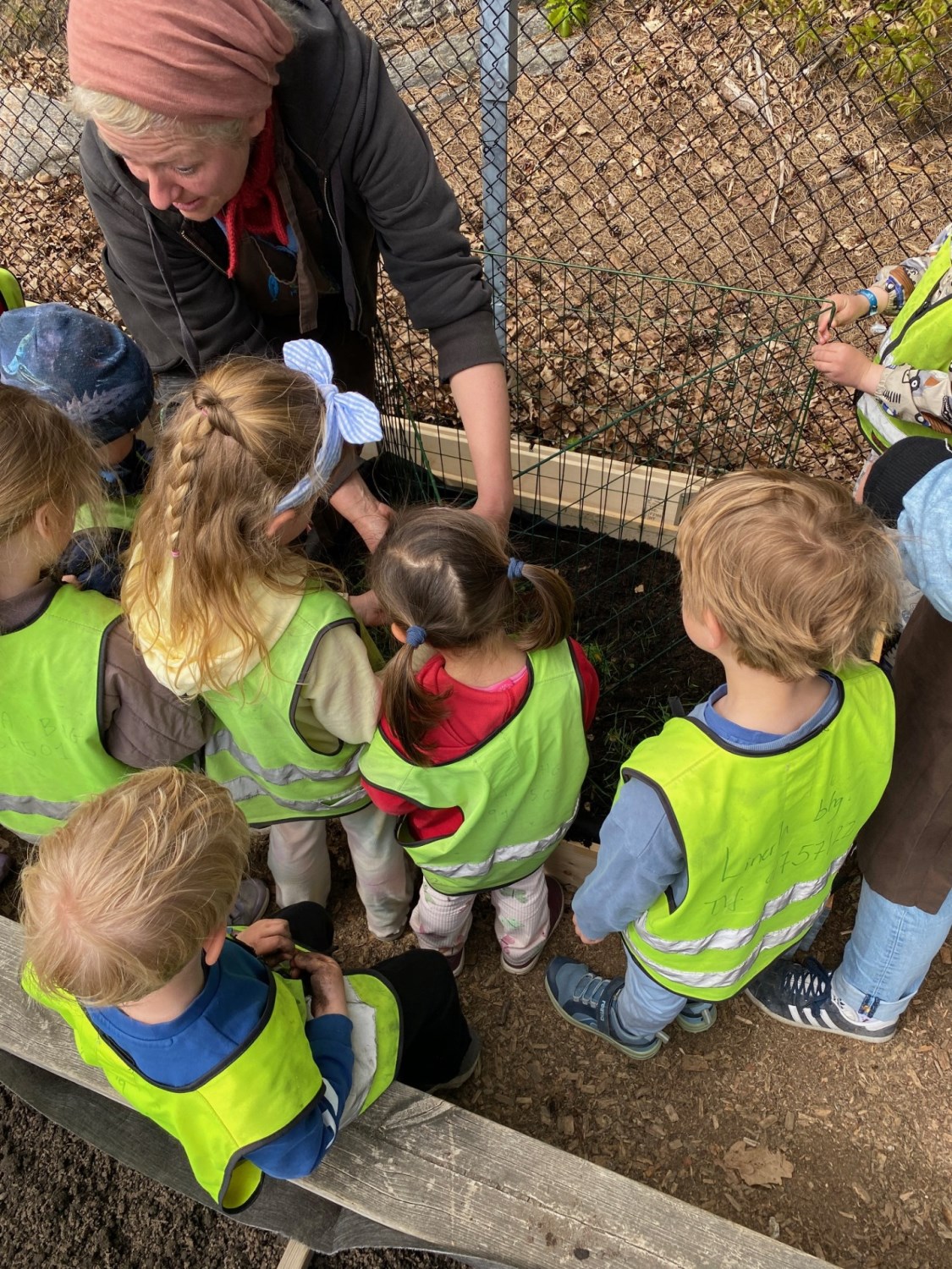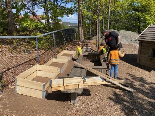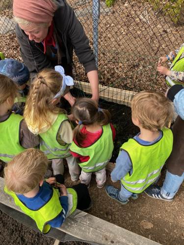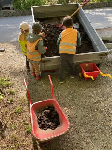 I mai kom representanter fra Geitmyra ut i barnehagen for å plante ut de forkultiverte plantene i jorda sammen med barna. Dette var veldig inspirerende og spennende. Barna fikk bl.a. være med å lage et "potettårn" hvor potetene skulle plantes lagvis, med jord, gress, ull osv.