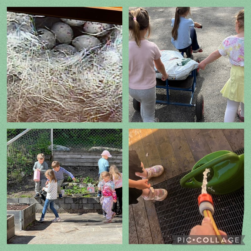 Vi har satt poteter og gulrotfrø i plantekassene, Barna har vært med på å fylle på jord, grave, sette frø og poteter og vanne. Det blir spennende å følge med på hva som vokser fram etterhvert.