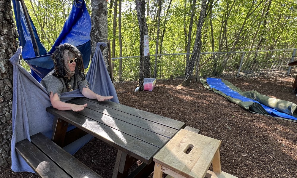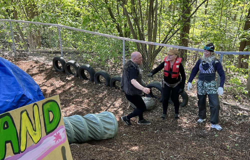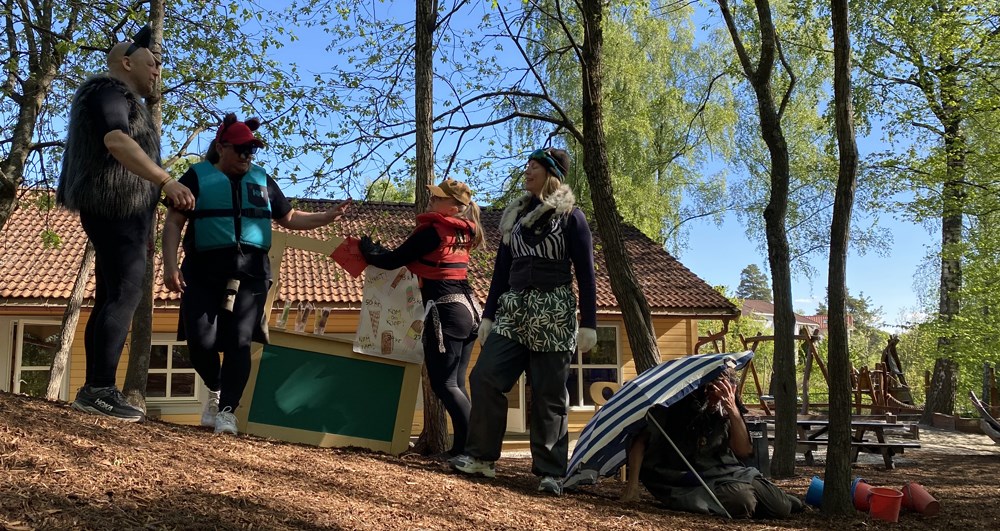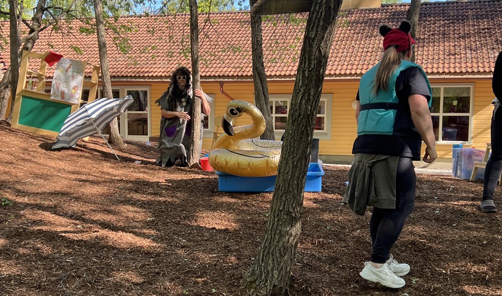 Først så kommer minste, men i stedet for å skli ned sklia så gjemmer han seg ved siden av sklia..