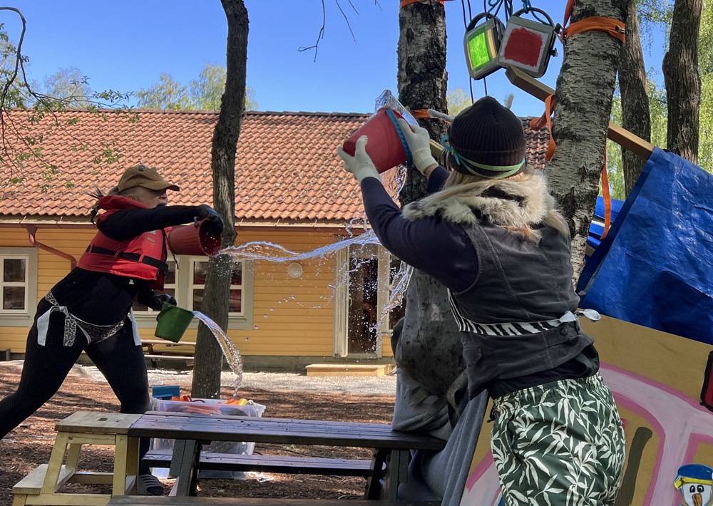 Men nå har bukkene Bruse fått en idé og så går de og finner noen bøtter som de fyller med bæsje-vann fra lille-bassenget. Bøttene setter de ved siden av den store sklia der Trollet sitter.