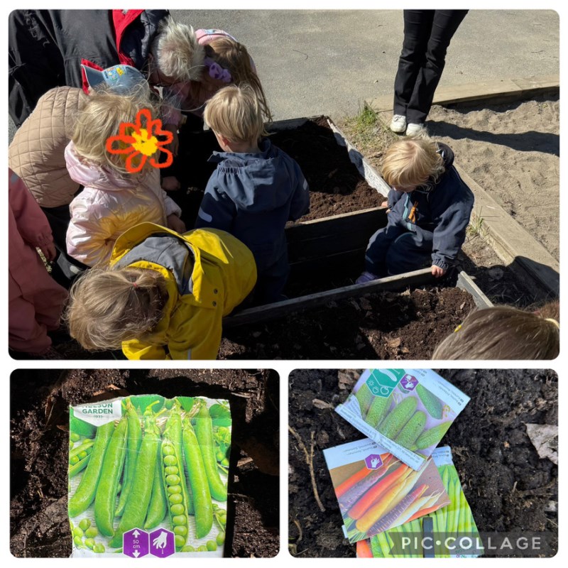Vi har plantet frø ut i plantekassene våre, og nå følger vi med på hvordan det spirer og gror. Vi har satt poteter og sådd gulrøtter, sukkererter og salat. Barna er med å vanne og passe på at det er best mulig vekstvilkår i jorda. Finner barna en meitemark vet de at den gjør underverker for plantejorda vår, så nå setter de den ut i blomsterbedene eller en av plantekassene.