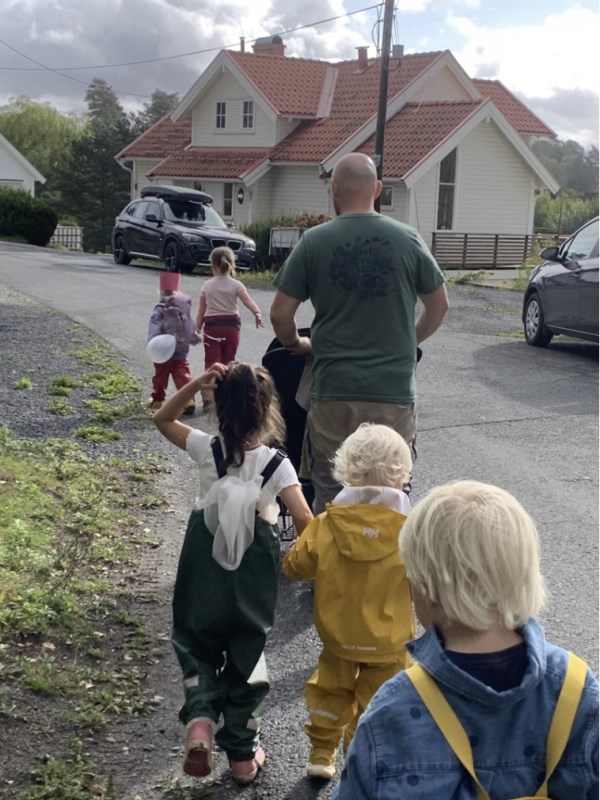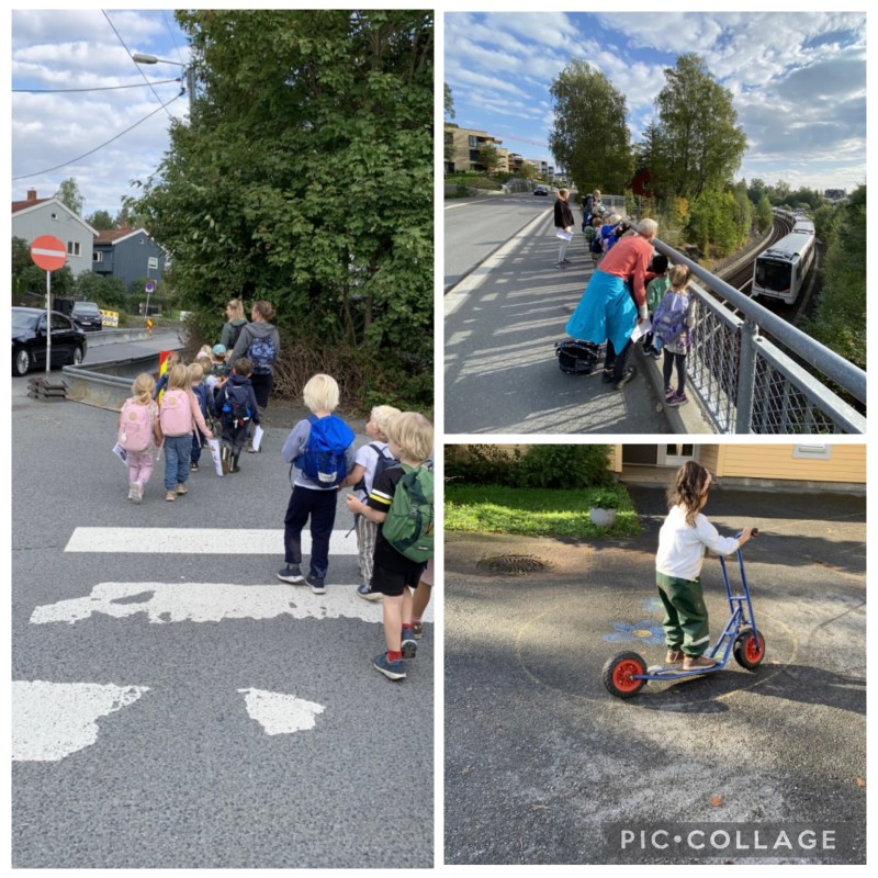 vi går over en vei. Vi har vært på tur med hele avdelingen (i bursdag) og med de ulike aldresgruppene i gruppetiden på onsdager. Vi har snakket om blant annet gode holdninger i trafikken