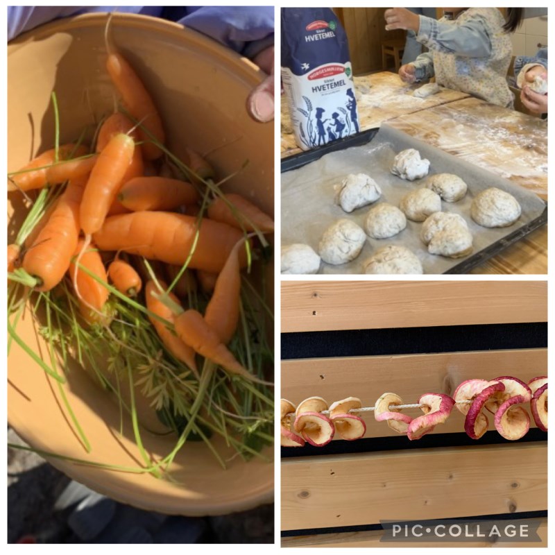 Vi har tørket epler og ruller stadig ut rundstykker. Vi har noe variasjon av grønnsaker ved siden av brød/rundstykker til lunsj hver dag.