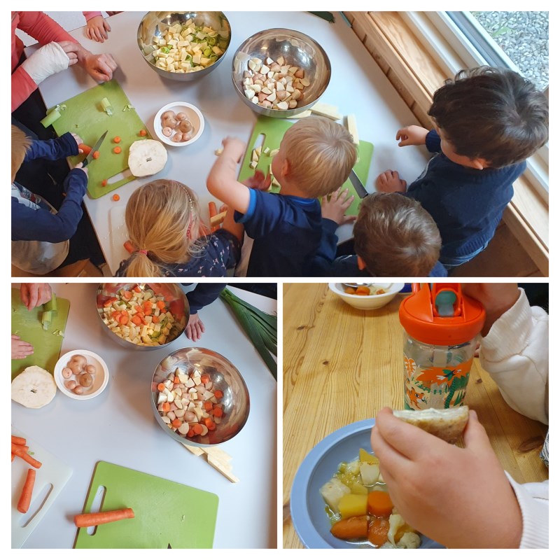 Vi laget grønnsakssuppe med ulike grønnsaker. Barna var