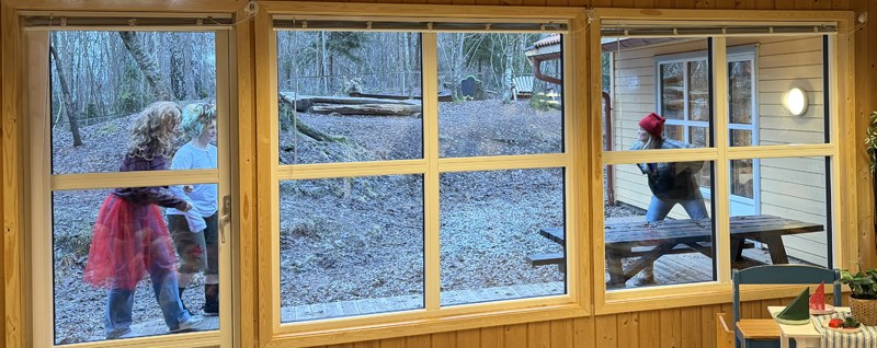 "DE ER DER UTE" roper barna og peker mot nissen og småtrollene. Og sannelig, der ute står de og trøster noen..