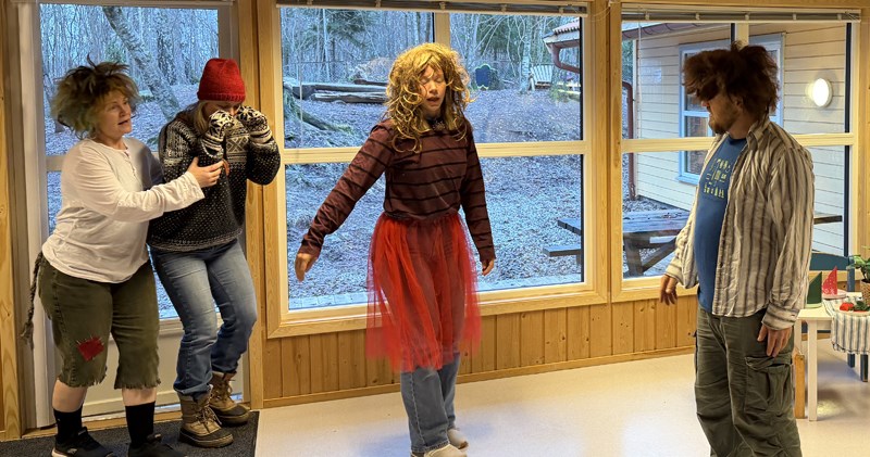 Plutselig ser vi en nisse som løper forbi ute. Han gjemmer seg bak bordet, men vi kan se at han er både lei seg og sint.