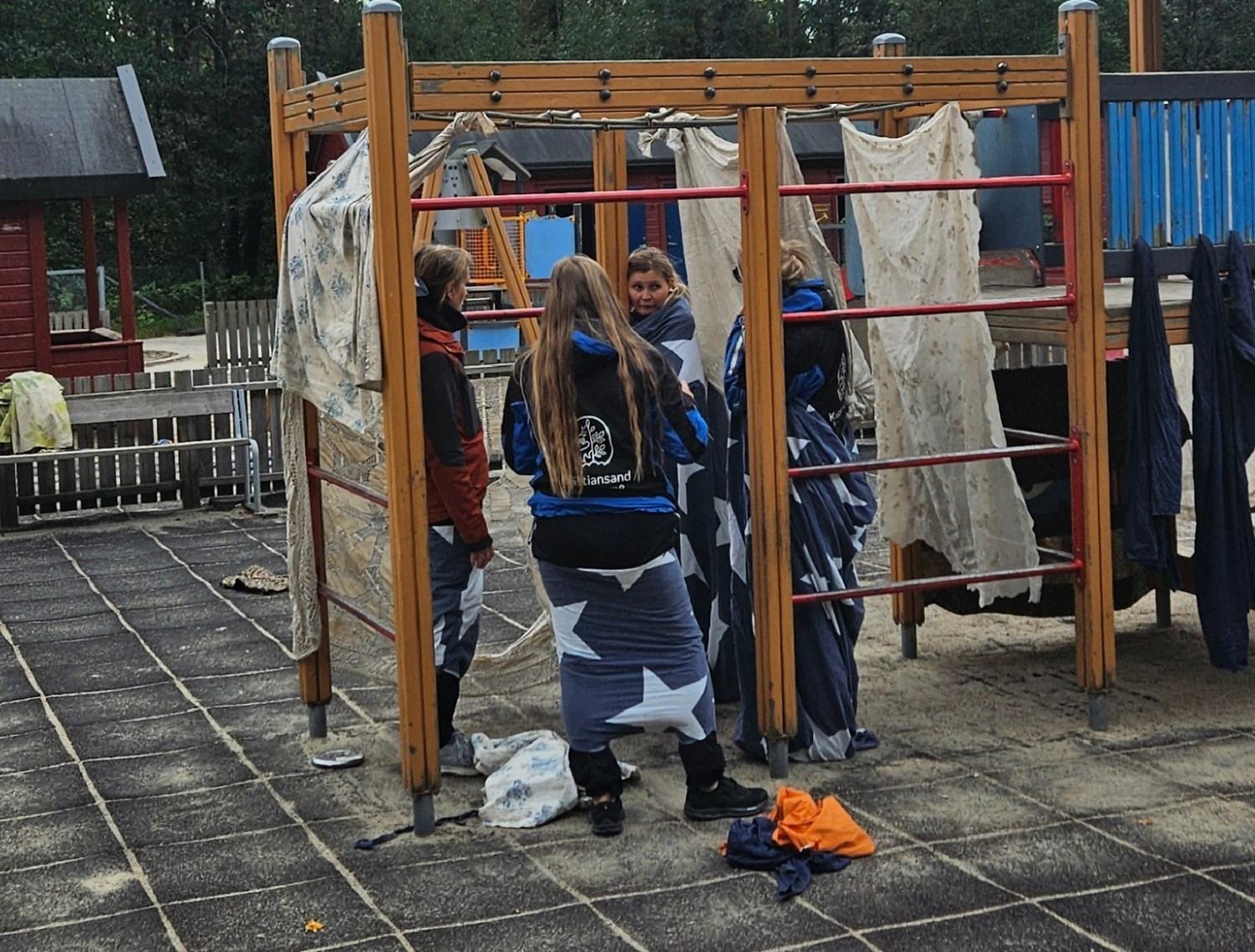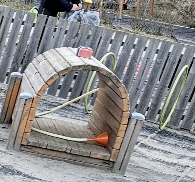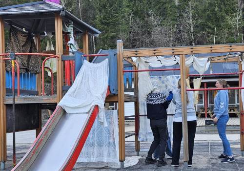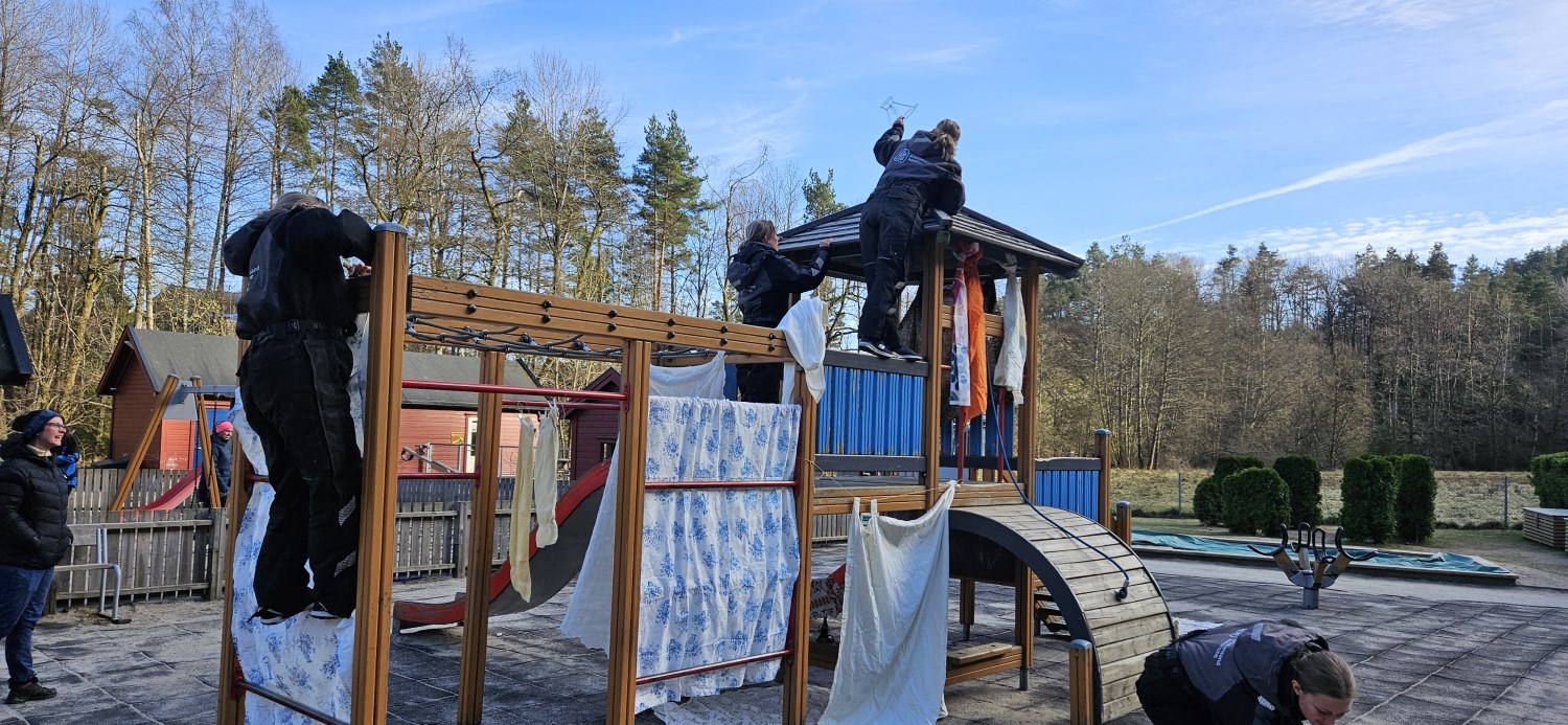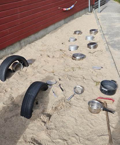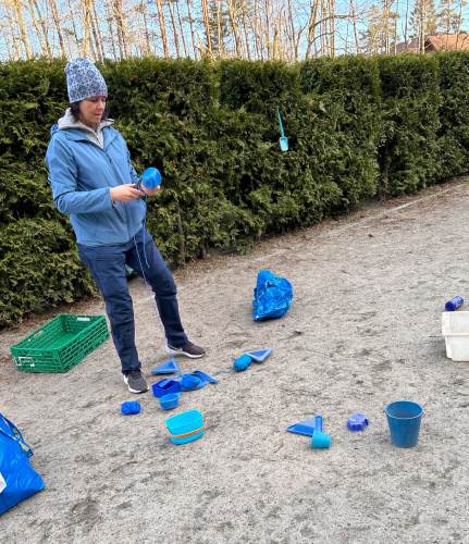 -Vi fikk i oppdrag å samle inn ulike materialer som skulle tilføyes på de ulike områdene, ting i fargen blå, ulike ting av tre, ulike stoff, plast og metallgjenstander. Materialene skulle være fleksible, og vi jobbet i grupper med å finne spennende måter å plassere det som skapte forstyrrelser i uteleks-området for å skape undring hos barna og få noe nytt til å skje.