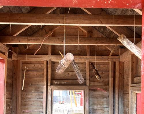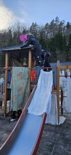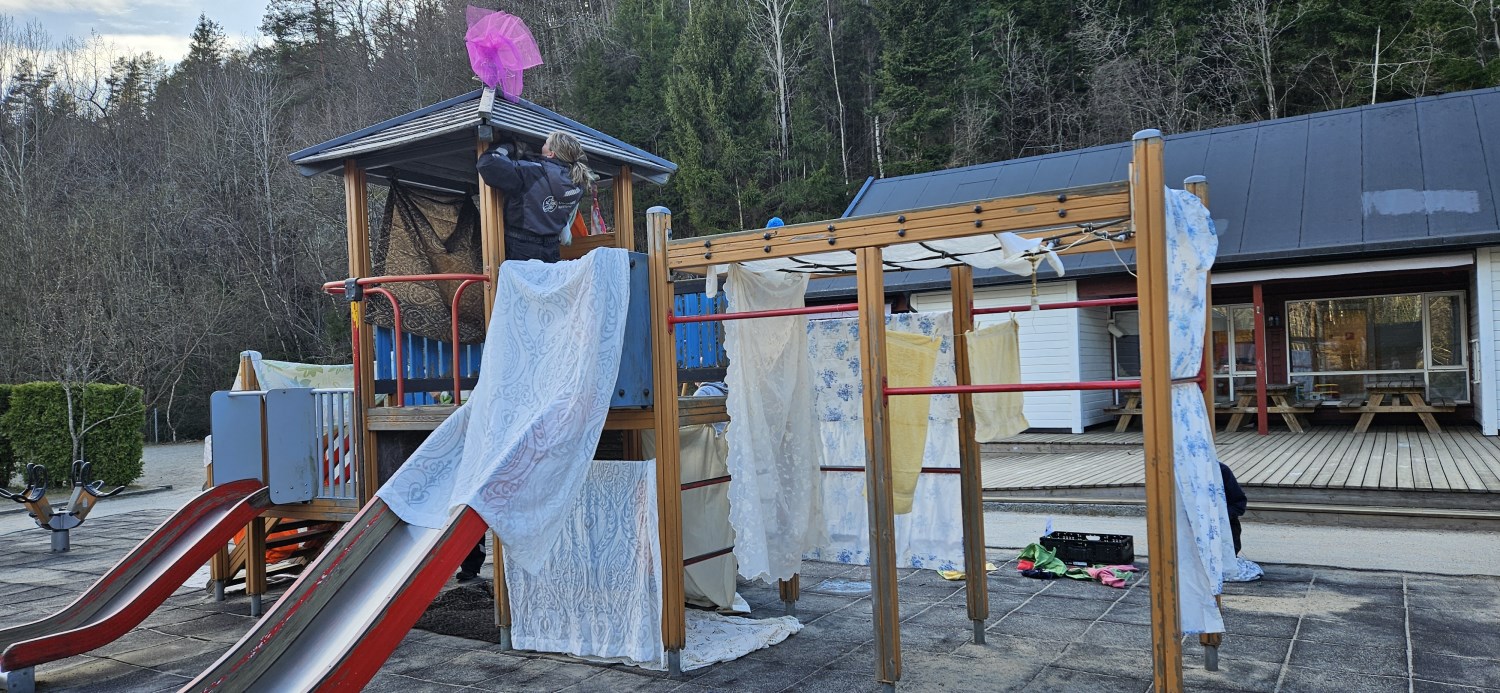 -Videre jobbet vi med å iscenesette området, der de ansatte fikk i oppgave å lage små improviserte forestillinger som skulle signalisere til barna "se her, kom hit, vent å se, kom å hør, dette er viktig/fint/rart" Målet var å vekke barnas nysgjerrighet og lyst til å utforske. I denne delen av prosjektet fikk de ansatte virkelig utfordre seg selv, og mange kjente litt på at de måtte gå utenfor komfort sonen, men vi så at det er mye læring i en slik opplevelse når en tross alt mestrer det og kanskje våger å gi mer av seg selv i leken med barna i neste omgang.