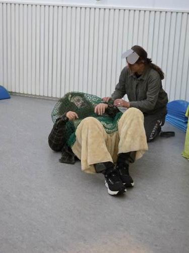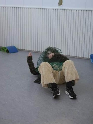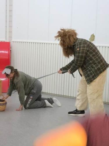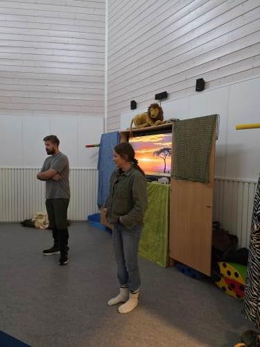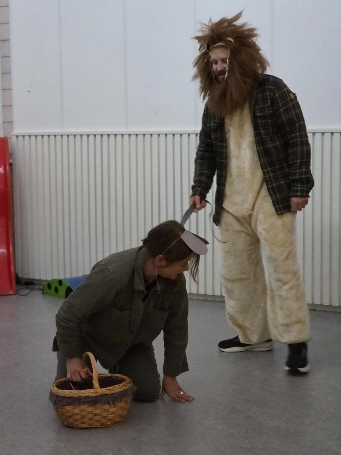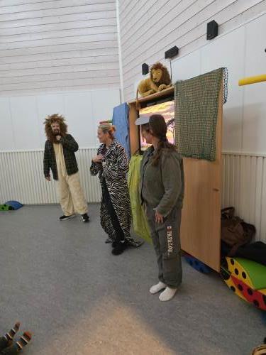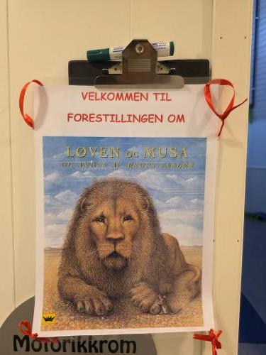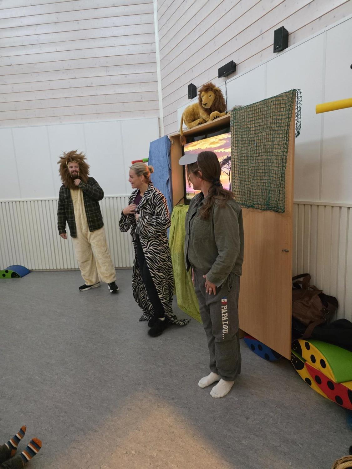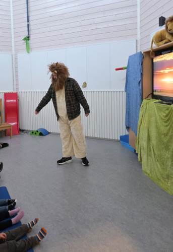 Da var det forestilling for 3- 6 åringene i barnehagen. De voksne kledde seg opp i kostyme foran barna og spilte så eventyret om Løven og Musa.