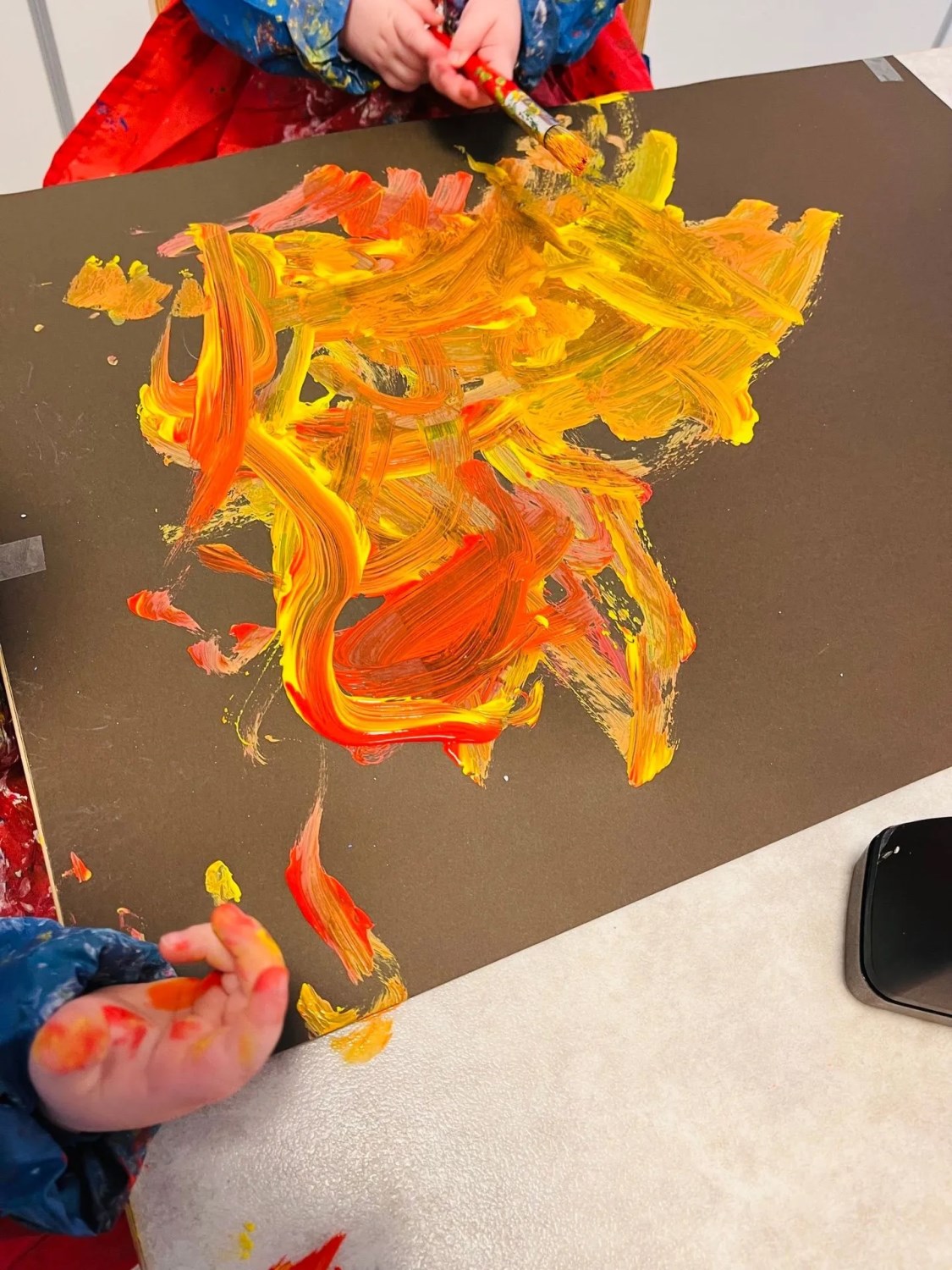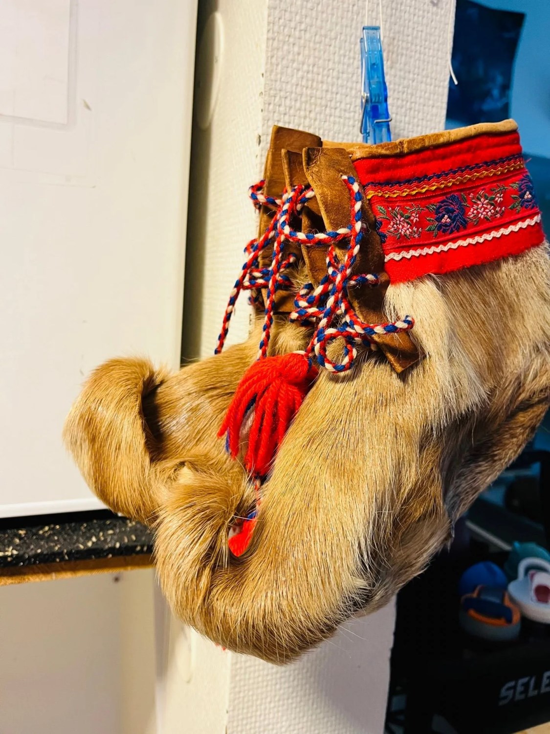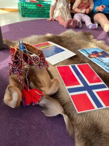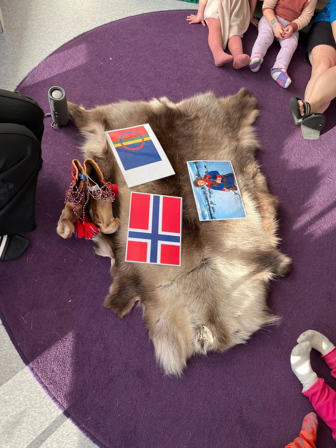 I samlingsstunden var alle de yngste barna invitert. Vi snakket om de to flaggene vi har i Norge, og sammen utforsket vi fargene og hva flaggene symboliserer. Barna fikk også kjenne på «skaller» – sko laget av reinskinn – og de fikk ta på et ekte reinskinn. Dette skapte undring og ga barna en konkret opplevelse av samisk kultur.