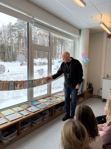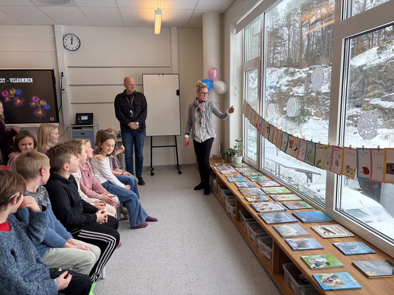 Turid Thorsen var på plass og rommet var pyntet med ballonger. Det var skikkelig god stemning i 3. trinnsrommet, da sjefen selv, selveste rektor Oddbjørn kom inn døra. Oddbjørn var buden for å klippe snora og få introdusert alle 30 faktabøkene, laget av 3. trinn. Hvert barn reiste seg når tittel og forfatter ble opplest av Turid. Barna fikk stolt motta applaus av rektor og resten av klassen. Videre feiret vi med kake og "Kompani Ord". En velfortjent avslutning på 2 ukers hard jobbing.
