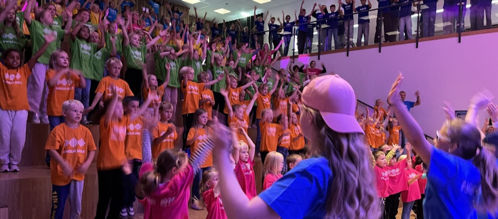 I dag møttes 2. og 6. trinn i idrettshallen for å danse sammen.