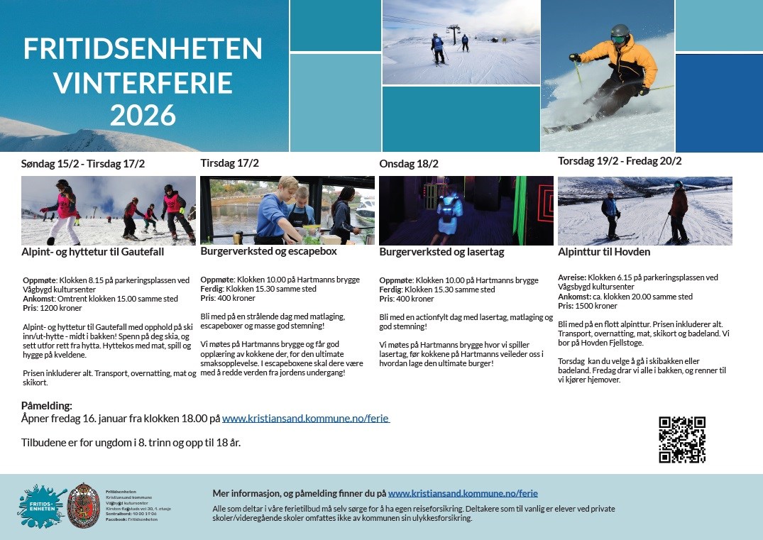 Bli med på en flott alpinttur. Prisen inkluderer alt. Transport, overnatting, mat, skikort og badeland. Vi bor på Hovden Fjellstoge. Torsdag kan du velge å gå i skibakken eller badeland. Fredag drar vi alle i bakken, og renner til vi kjører hjemover.