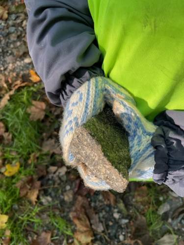 med barna om hva mose er og kjenner på den og lukter på den. Noen finner fine
