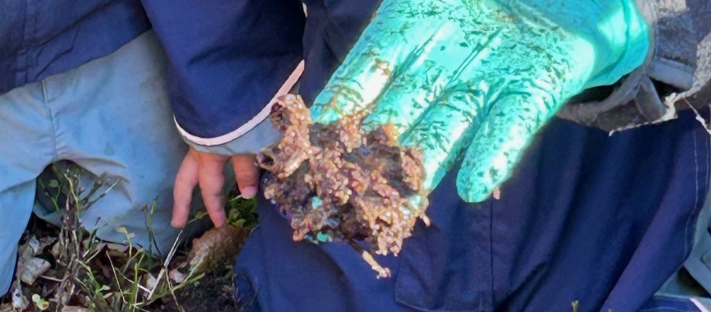 Før sommeren gravde vi ned litt forskjellig søppel, nå har vi gravd det opp.