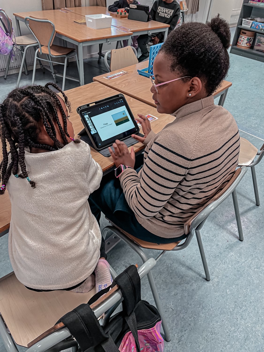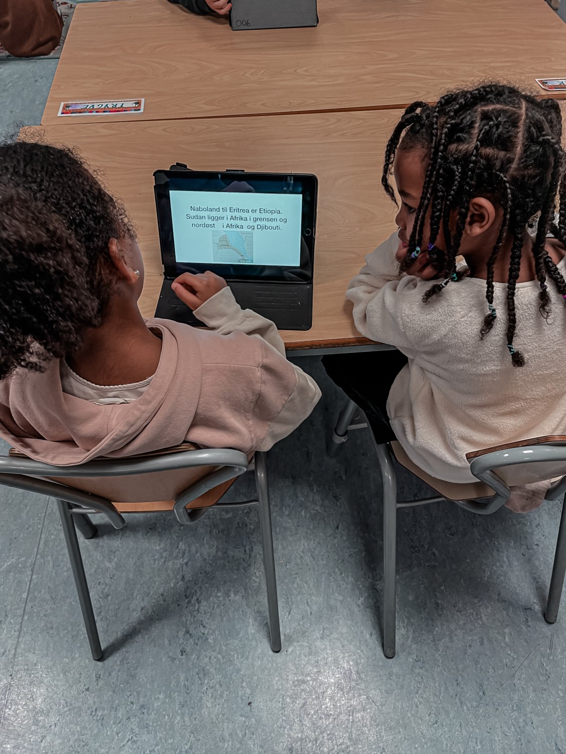 4.klassingene brukte starten av timen til å vise fram og fortelle fadderbarna på 1.trinn om landene sine. De satt sammen i par eller små grupper, viste og fortalte. 4.klassingene syntes det var stor stas å få vise fram, og 1.klassingene syntes det var gøy å se hva de store hadde å fortelle.
