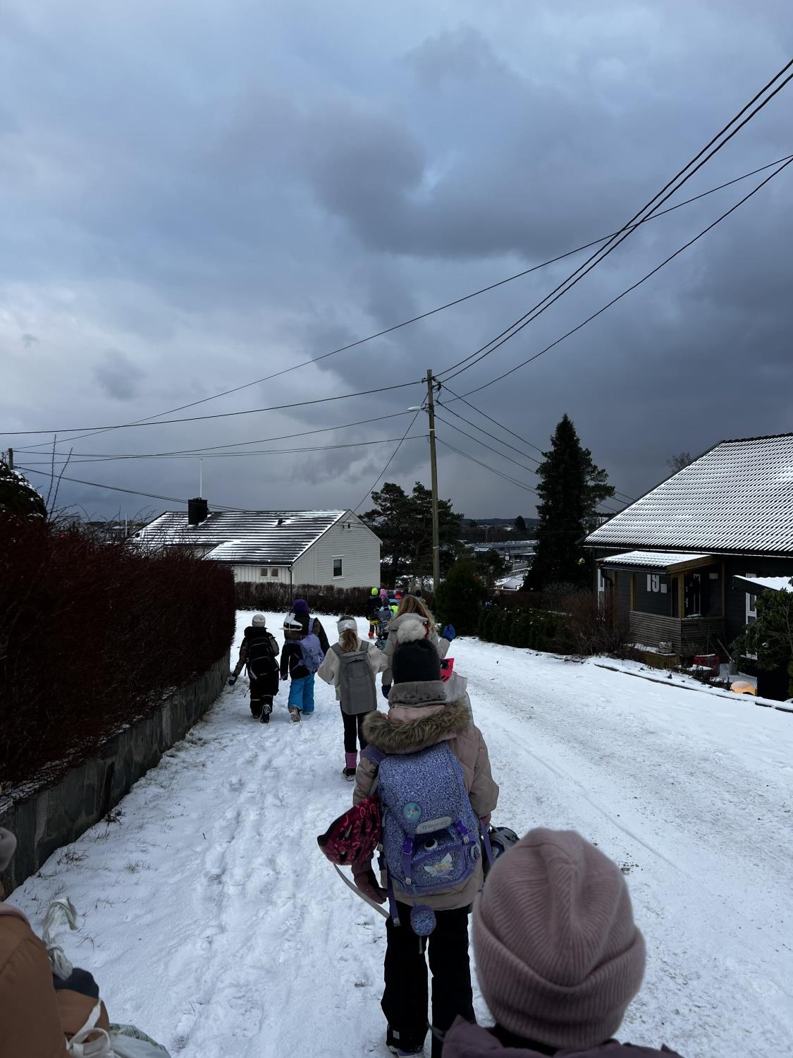 Vi gikk til Blåbærtjønn tidlig på dagen. Det var en lang og tung gåtur. Alle hadde sekk med mat og ved, hjelm og skøyter.