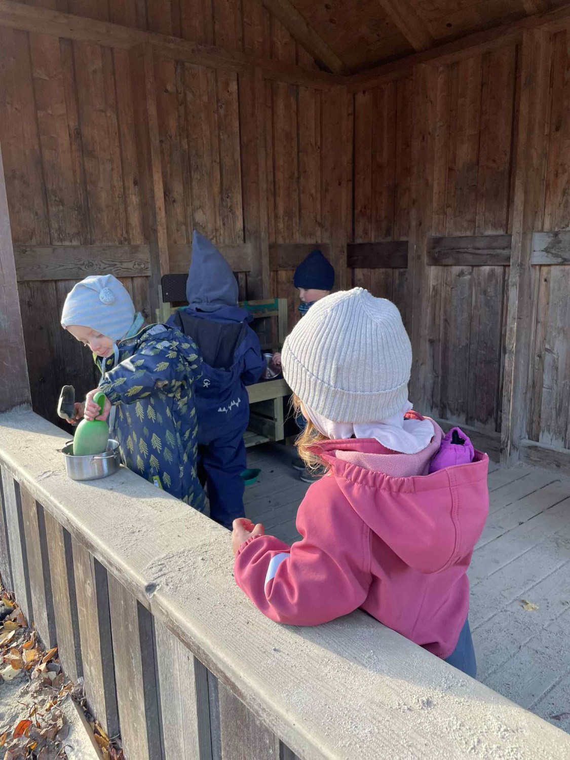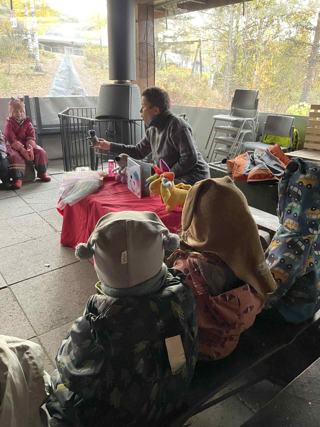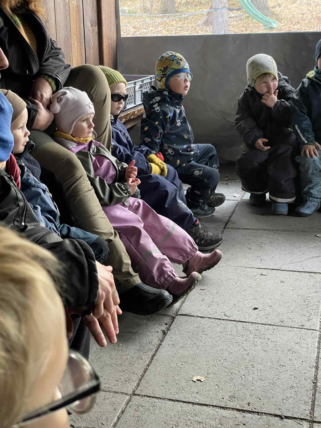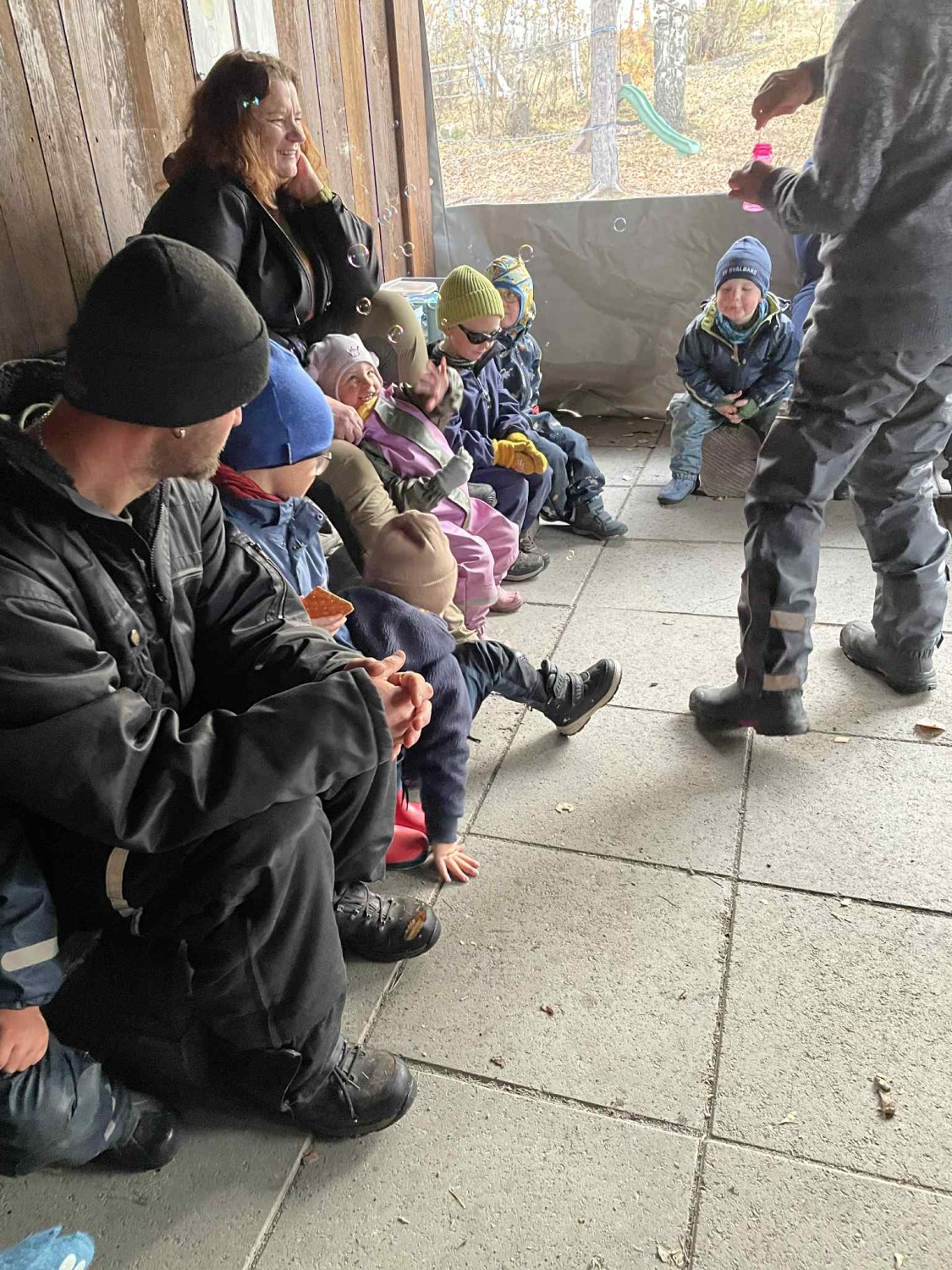 Vi spiste fiskekaker og brød i gapahuke, barna kunne velge mellom å sitte ute rundt bålet eller inne i gapahuken.