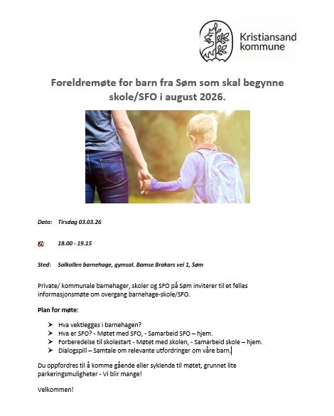 Kommunale/private barnehager, skoler og SFO på Søm inviterer til et felles informasjonsmøte om overgang barnehage-skole/SFO