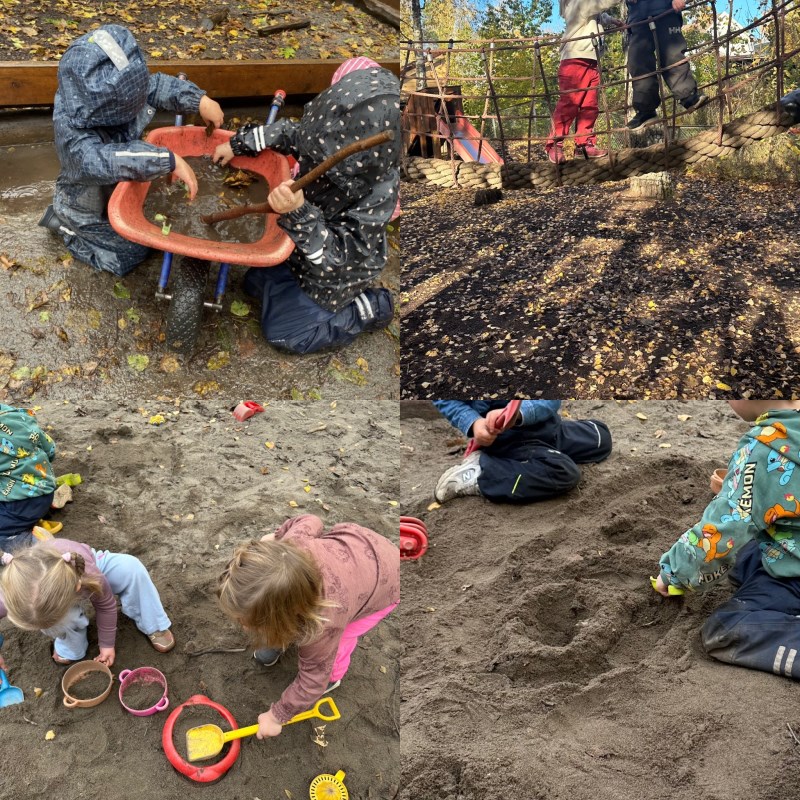 sykling. I sandkassen bygger barna byer med veier og tunneller, og lager kaffe,