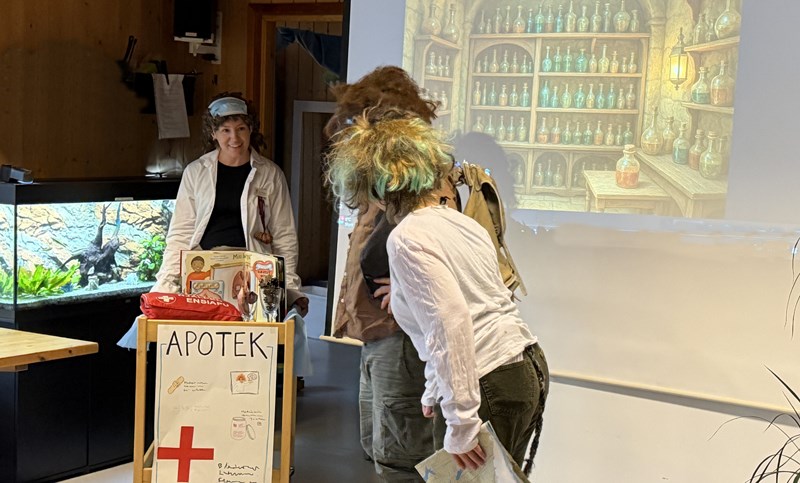 "Hva? Sjumilsstøvler?? DET har jeg ikke sett før - det finnes jo ingen slike støvler lenger" sier apotekeren og kommer frem fra disken. Hun kikker på støvlene til pappa og blir veldig ivrig.