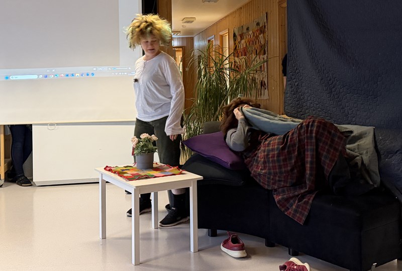 "Ja, SE da" sier Tambar og peker på mamma som ligger på sofaen.