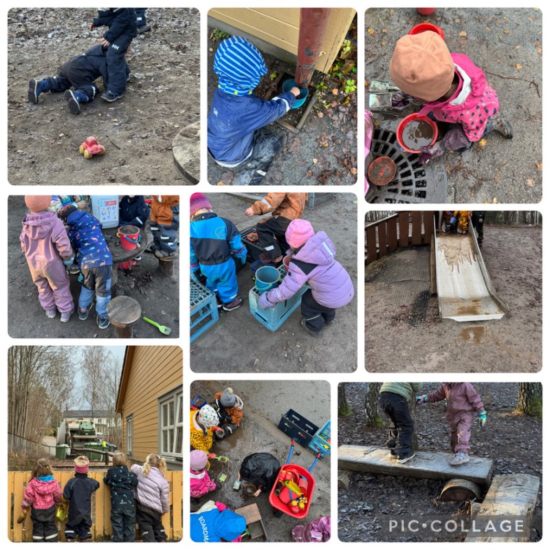 November har vært en måned med mye varierende vær, det har vært vått og mye lek med vann, men så kom minusgradene og tela satte seg i bakken. Vi har sett antydning til snø, og fikk forhåpninger om akebakke og snølek, men det ser ut til at vi må vente enda en stund på det. Skiftende vær og temperatur gir god øvelse og erfaring i hva som er lurt å ha på seg når vi skal leke ute. Vi snakker mye om dette – hvordan hadde du det ute i går, var du varm eller kald? Hvis du frøys i går, er det lurt å ta på litt ekstra klær i dag. I går var det minusgrader og kaldt ute, i dag er det plussgrader og varmere – hva skal vi gjøre da? Når barna er med å reflektere og planlegge lærer de etter hvert å ta gode valg på egenhånd utfra egne behov.