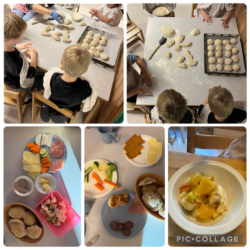 I november har vi hatt vårt vanlige mattilbud med grovbrød mandag og fredag, hjemmebakte grove rundstykker tirsdag og torsdag og rosagrøt på onsdager. Barna får tilbud om oppskåret grønnsaker og frukt hver dag. I november har vi hatt kokt blomkål og brokkoli hver uke, i tillegg til agurk, gulrot og paprika. Bodil koker egg til oss, og inni mellom får barna fiskepudding eller stekte fiskekaker å ha på brødskiva/rundstykkene. Vi vet at barna inne på musehullet er veldig glad i brunost, og ofte spør de etter mer når det er tomt på bordet, men vi øver på å prøve andre pålegg, og når det er tomt for brunost må man heller velge noe annet det er mer av. Det er også en fin øvelse i å tenke på andre enn seg selv, hvis man er grådig og tar mange brunostskiver til seg selv kan vennen ved siden av gå glipp av det. Vi må forsyne oss med måtehold og passe på at det er nok til alle som vil ha.