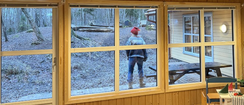 Plutselig ser vi en nisse som løper forbi ute. Han gjemmer seg bak bordet, men vi kan se at han er både lei seg og sint.
