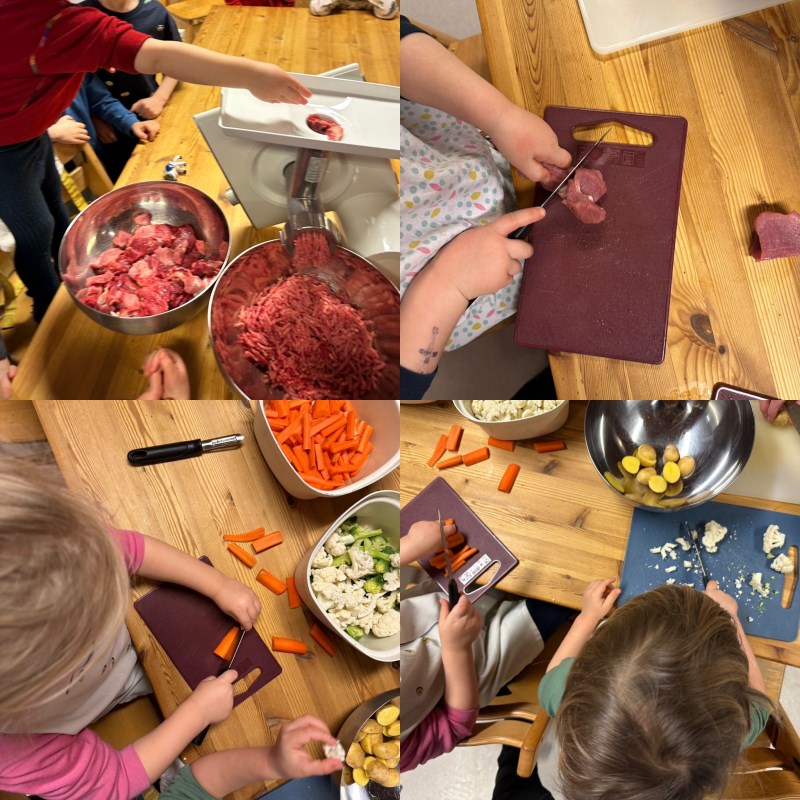 med barna: fra å dele kjøttet i biter, kverne det med en ekte kjøttkvern, til