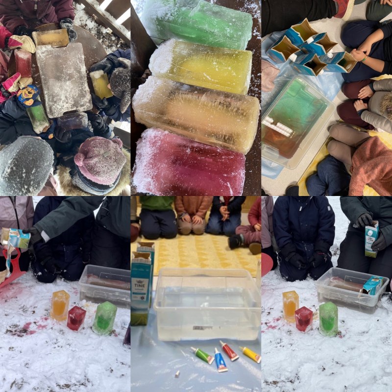 som ble fryst. Vi snakket om primærfarger og observerte hvordan isen så ut