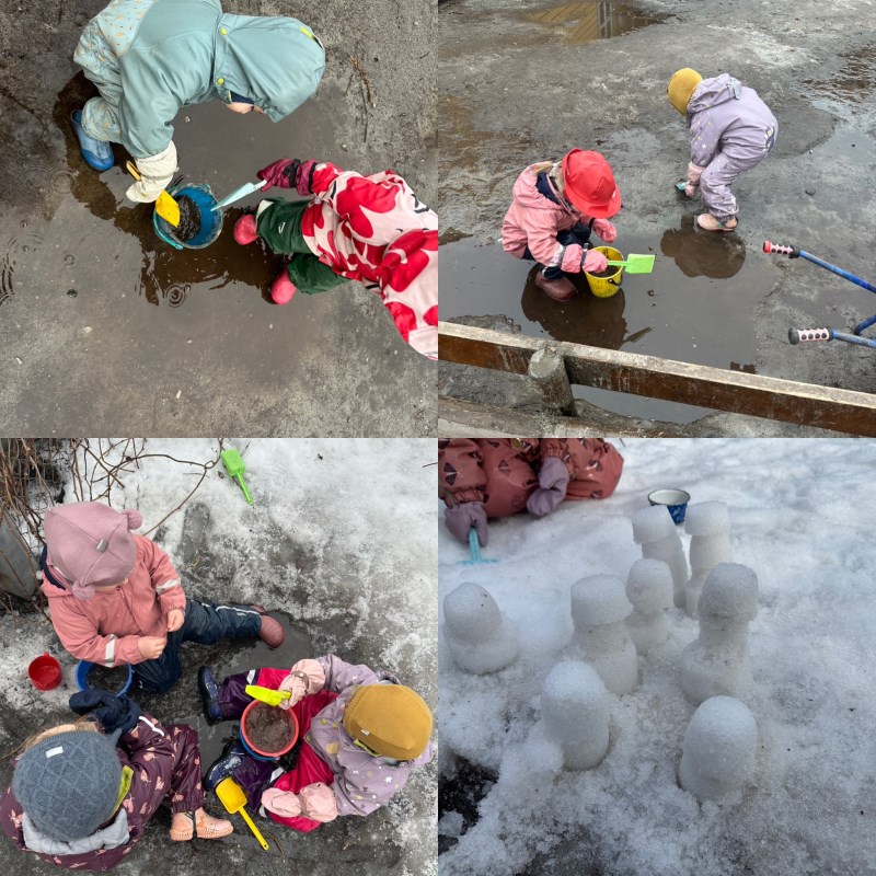 førte til dammer og gjørme, som inspirerte til kreativ lek. Barna laget «mat»