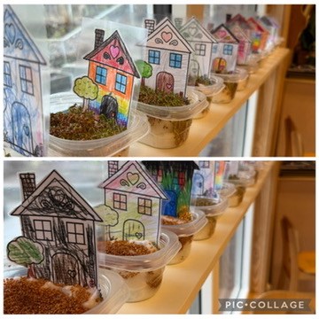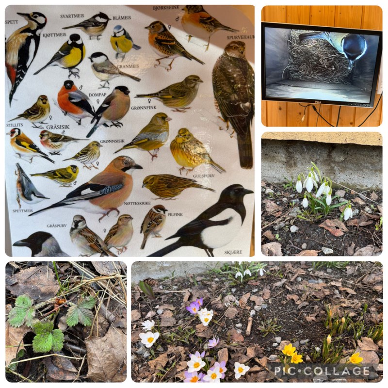 Det har begynt å komme knopper på trærne og noen blomster har begynt å spire. Det er fristende å plukke det som vokser fram for å blande i vann/søle og lage diverse matretter, så vi snakker mye med barna om å la trær og blomster vokse i fred en god stund til før vi kan begynne å plukke til sommeren. Det er også forskjell på det som vokser vilt og fritt i skogen, og det som er plantet i blomsterbedene. Skogen er på vei ut av vinterdvale, og vi må behandle den med respekt. Det er spennende å følge med på fra uke til uke hvor mye som vokser opp og fram. Blåmeisen holder nå på å flytte inn i fuglekassen vår, og vi følger prosessen med redebygging og egg.