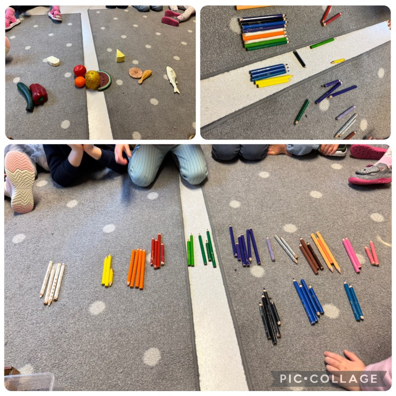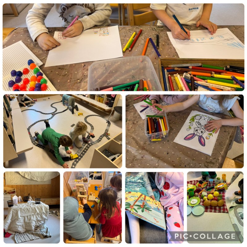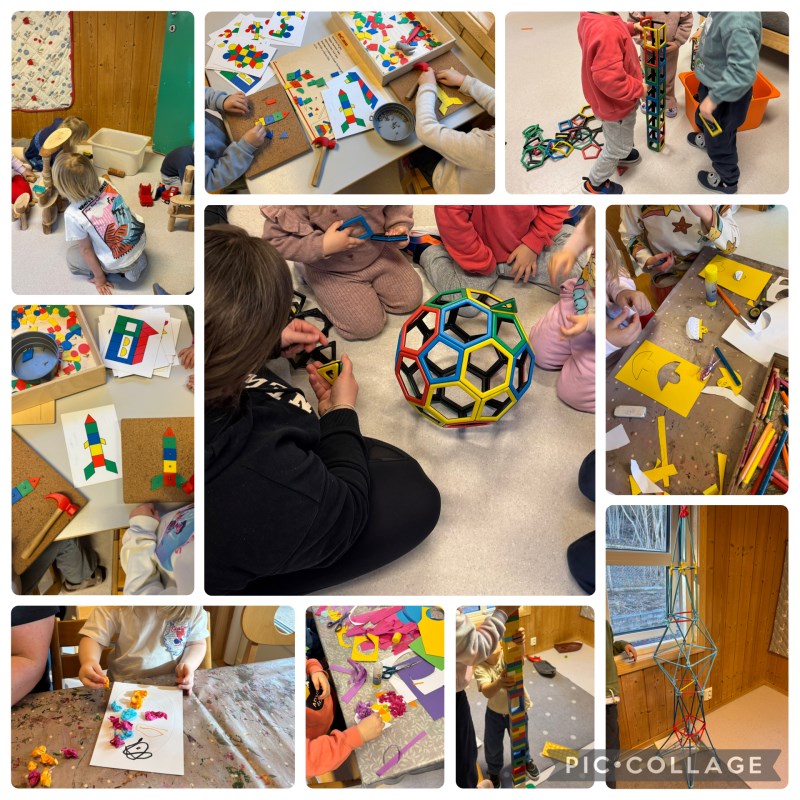 Denne måneden har vi hatt ekstra fokus på «antall, rom og form». I det ligger hverdagsmatematikk som telling og mengde, kategorisering, sortering, romforståelse og geometri. I mars har vi hatt mye ulik konstruksjonslek på musehullet med ulike geometriske former, og vi benevner alltid formene barna bruker. Vi har tegnet, klippet og limt mye påskepynt, og vi har brukt samlingsstund til å lære om sortering og kategorier.