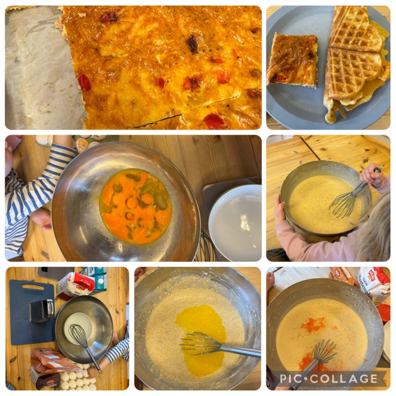Vi har også laget mat med egg. Barna har vært med å brainstorme ulike måter å tilberede egg, og hvilke matretter vi har der egg er en essensiell brikke i retten. Sammen ble vi enige om å lage grove, næringsrike vafler og omelett til lunsj. Barna var med på prosessen, alle fikk hakke egg i røra og vi målte opp de ulike ingrediensene sammen. Vi har også sett en episode av Kråkeklubben på nrk som handler om egg.