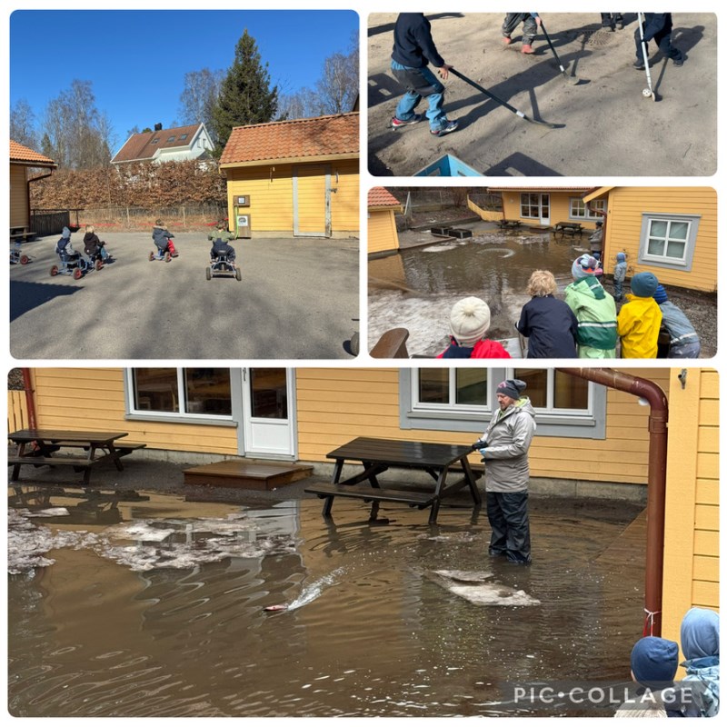Måneden startet med snø og is på uteområdet, det har vært veldig vått og mye lek med vann fra både snøsmelting og regn. En dag i midten av mars var det så mye vann på uteområdet foran musehullet at vi kunne kjøre med Axel sin fjernstyrte båt. Mot slutten av måneden var all snø og is smeltet, og våren har gjort sitt inntog for fullt. Nye vårtegn springer fram nesten for hver dag, og en stor glede har vært å finne fram barnehagens sykler i utetiden. Det er også et sikkert vårtegn.