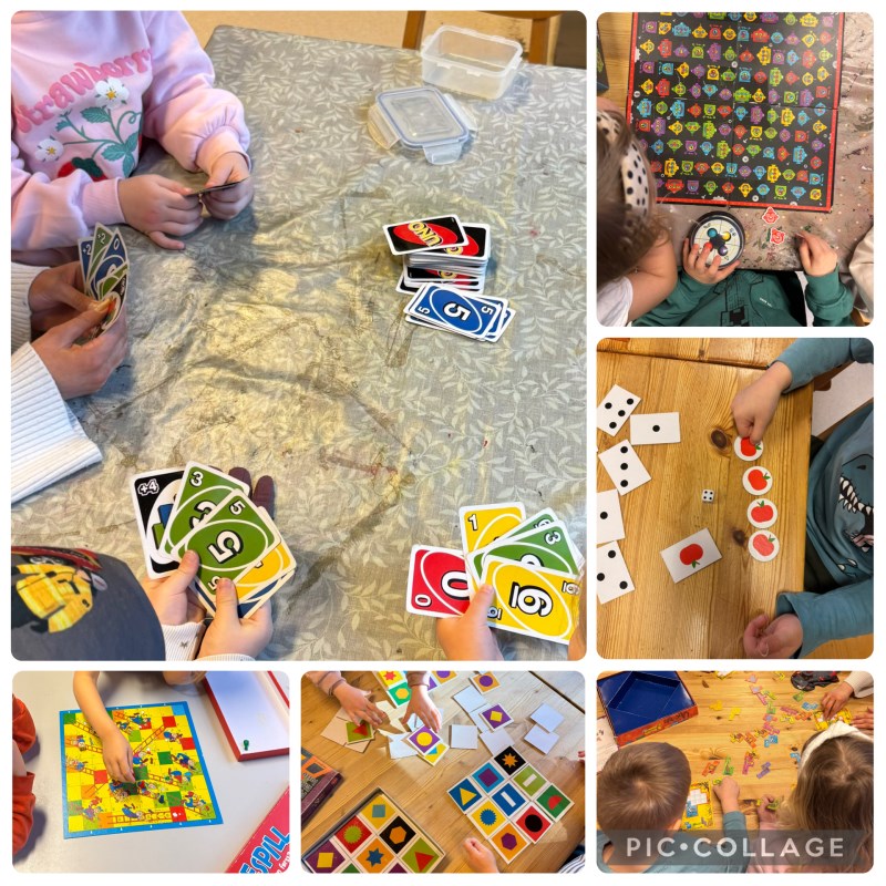 Vi har også spilt mer spill, både på avdeling og i gruppetiden på onsdager. Vi har funnet spill som handler om telling, men vi har også ulike spill med geometriske former som skal passe sammen i et mønster, eller hvor man skal finne et bestemt fargemønster.