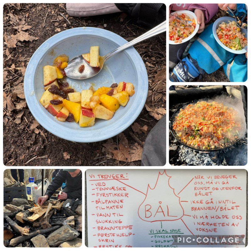 I midten av mars skulle vi ha mat på bål, vi forberedte oss dagene i forveien der barna valgte hva vi skulle lage av mat, og vi lærte om bålvett og brannsikkerhet. Så kom dagen med sterk vind og mye regn, og vi så oss nødt til å utsette turen ut i skogen, både pga sikkerhet og fordi mat på bål ikke skal være noe vi bare gjør, det skal være en positiv opplevelse med mulighet for læring. Mat på bål ble dermed fredag før påske sammen med Regnbuen. Da spiste vi stekt laks og grønnsaker med fullkornpasta. Til dessert ble det frukt stekt/kokt i honning med naturell yoghurt og rosiner til de som ville ha. Barna satt rundt bålet da Martin tente opp, og lærte hva som skal til for å få fyr på bålet. Maten vi skulle lage på den opprinnelige bålturen vår var barna med å lage den fredag vi skulle hatt bål. Så i mars fikk vi to dager med varmmat.