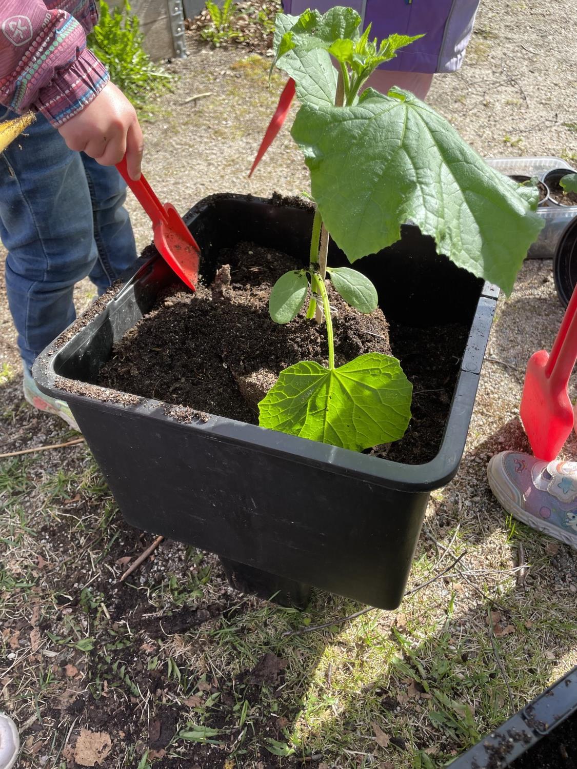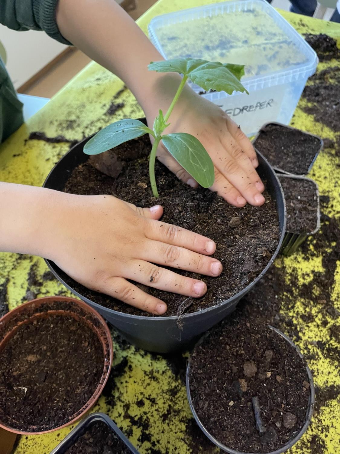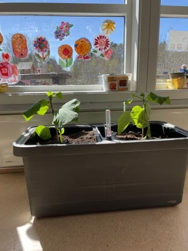 I mars sådde vi agurker på Kjøttmeis. Etter en liten uke begynte de å spire og etter noen uker til måtte de få større potter. I dag fikk agurkene enda større potter og de står nå i en selvvanningskasse på avdelinga. Så får vi bare vente tålmodig til de første agurkene er spiseklare.