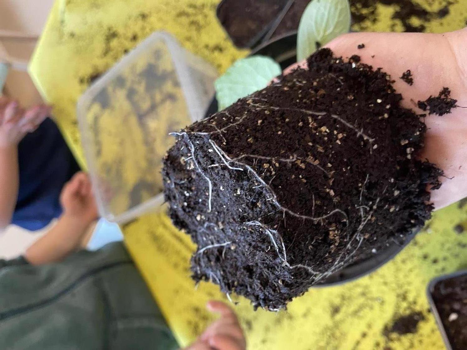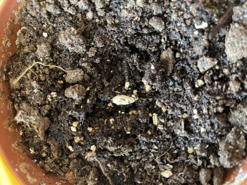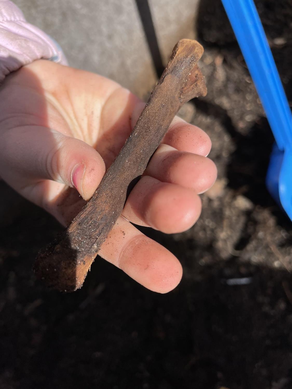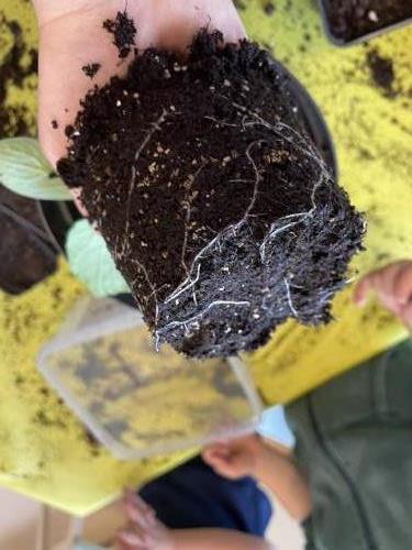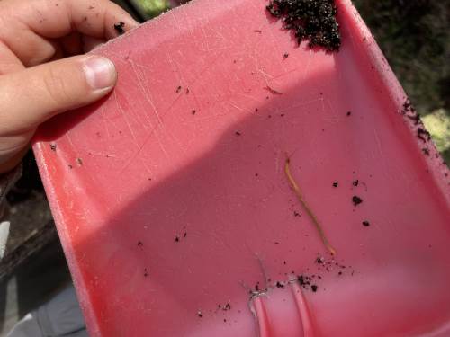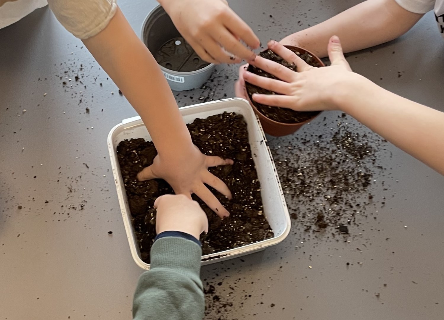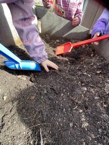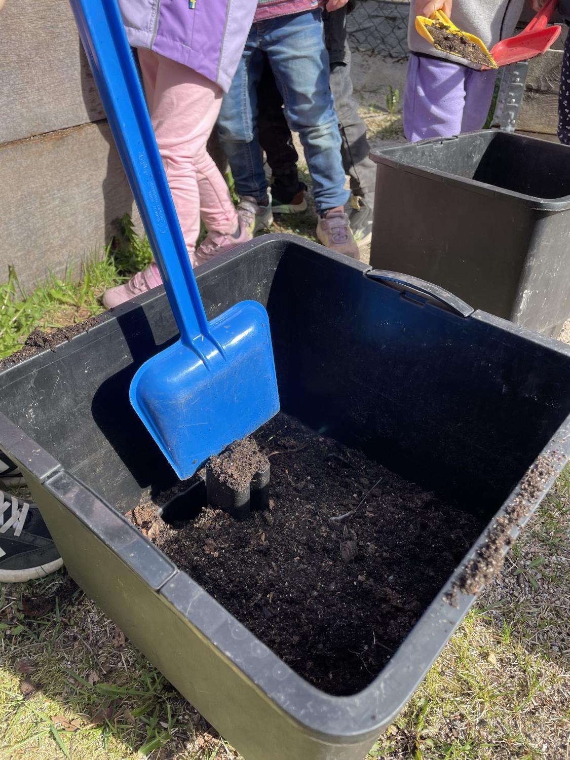 Barna er med på å fylle jord i potter, putte oppi frø og å potte om. De hjelper mer enn gjerne til. I dag, da vi skulle fylle jord oppi de store pottene, tok vi det fra en pallekarm det ikke er sådd noe i. Da fant de meitemark, larver, skjell og noe som de lurte på om kunne være et lite dinosaurbein. Eventuelt et hundebein eller løvebein. Det er nesten som en skattejakt!